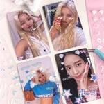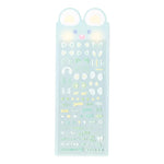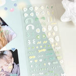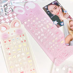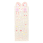 This sticker sheet includes cute accents such as bear and rabbit ears, stars, hearts and is perfect for photocard decoration.
