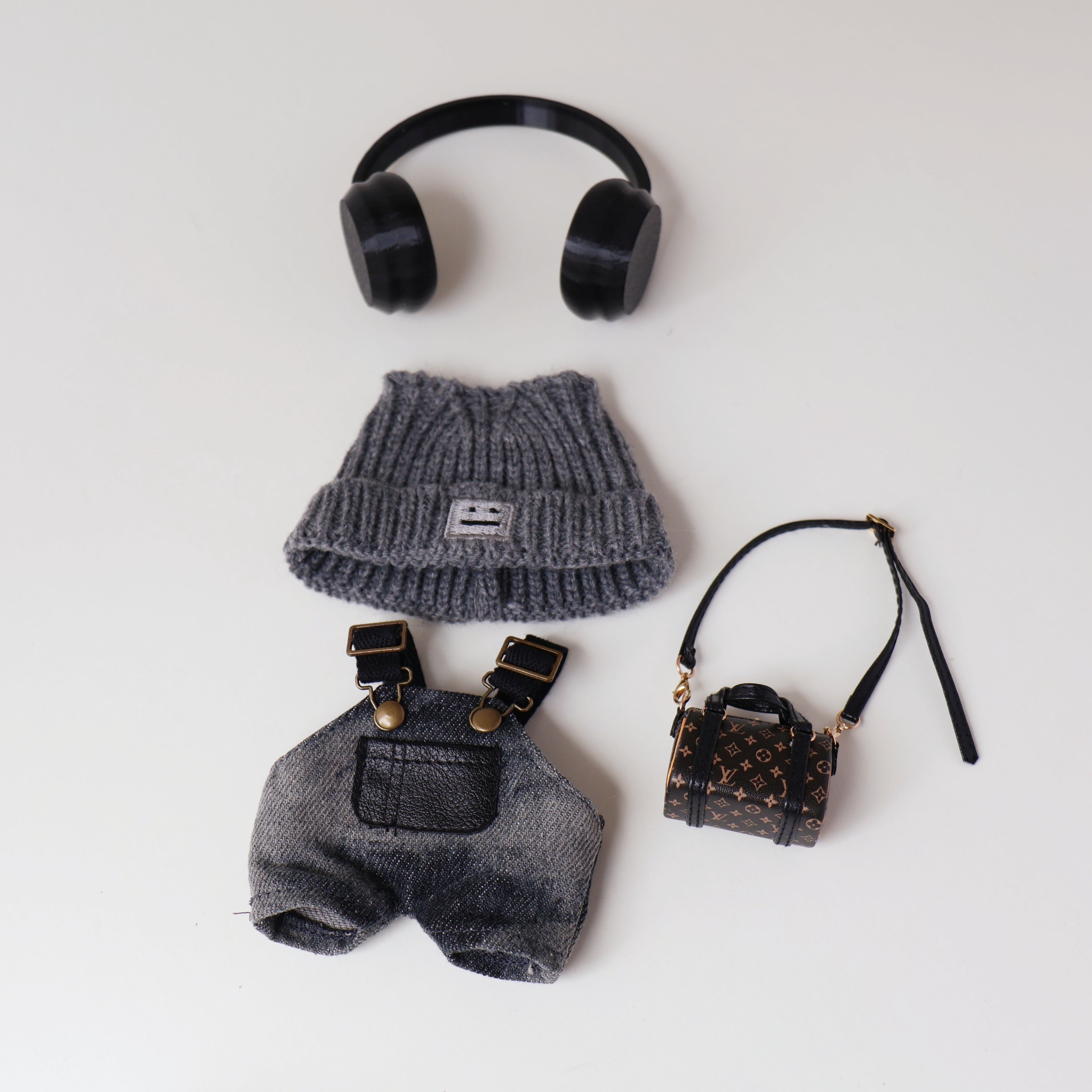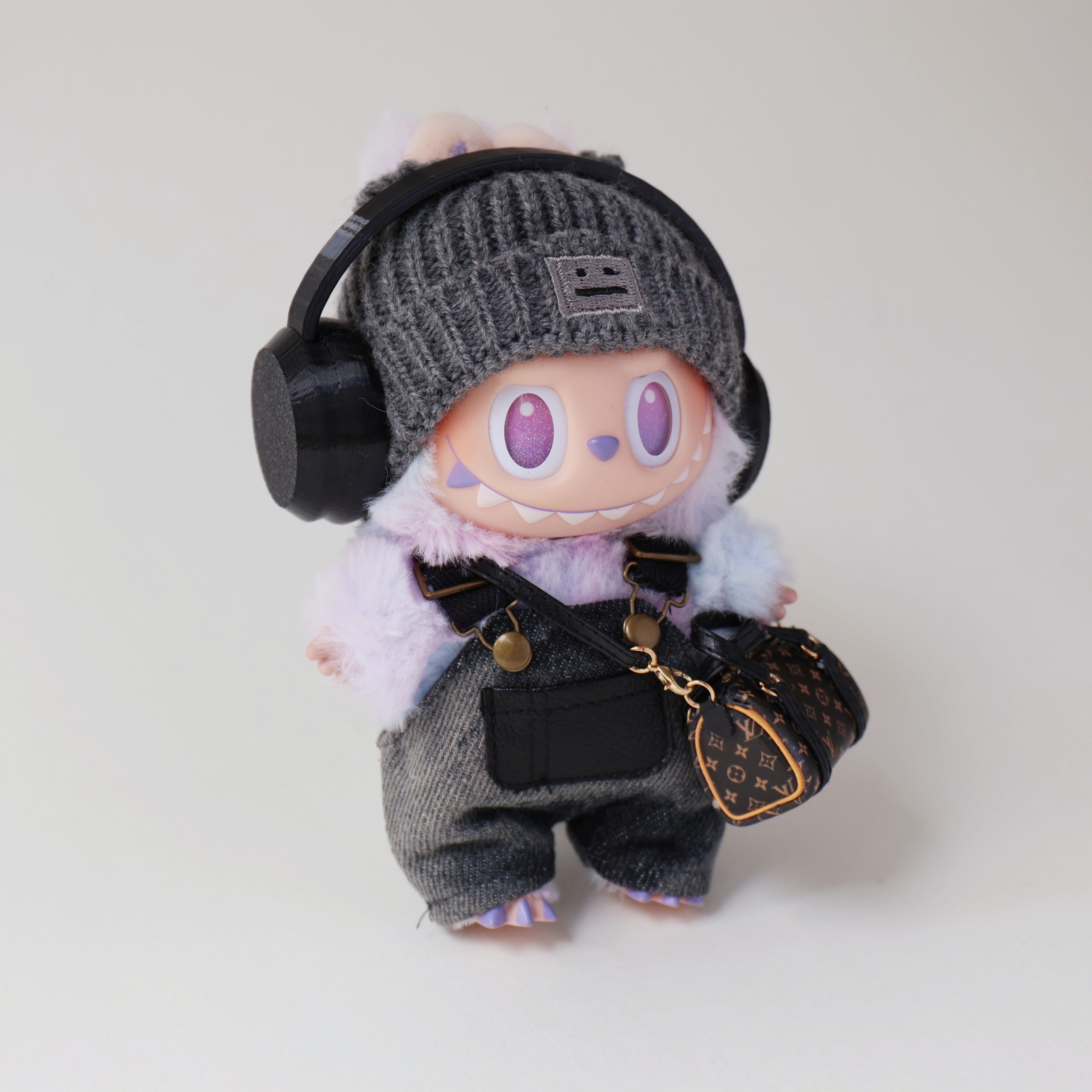 Knitted Beanie & Headphones: A gray knitted beanie with an embroidered patch and a pair of chunky black headphones give your Labubu a laid-back, urban vibe.